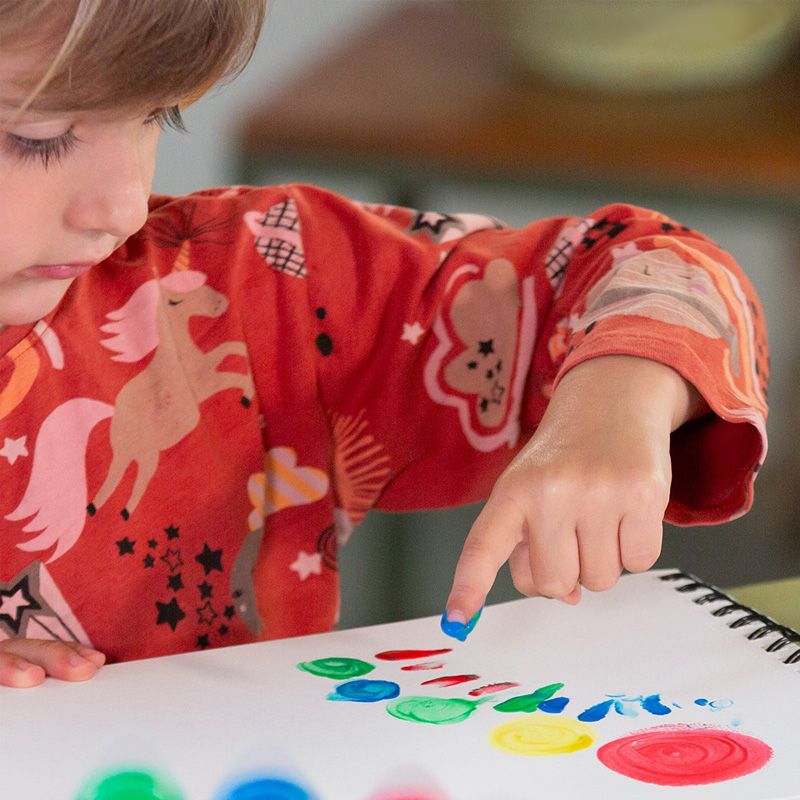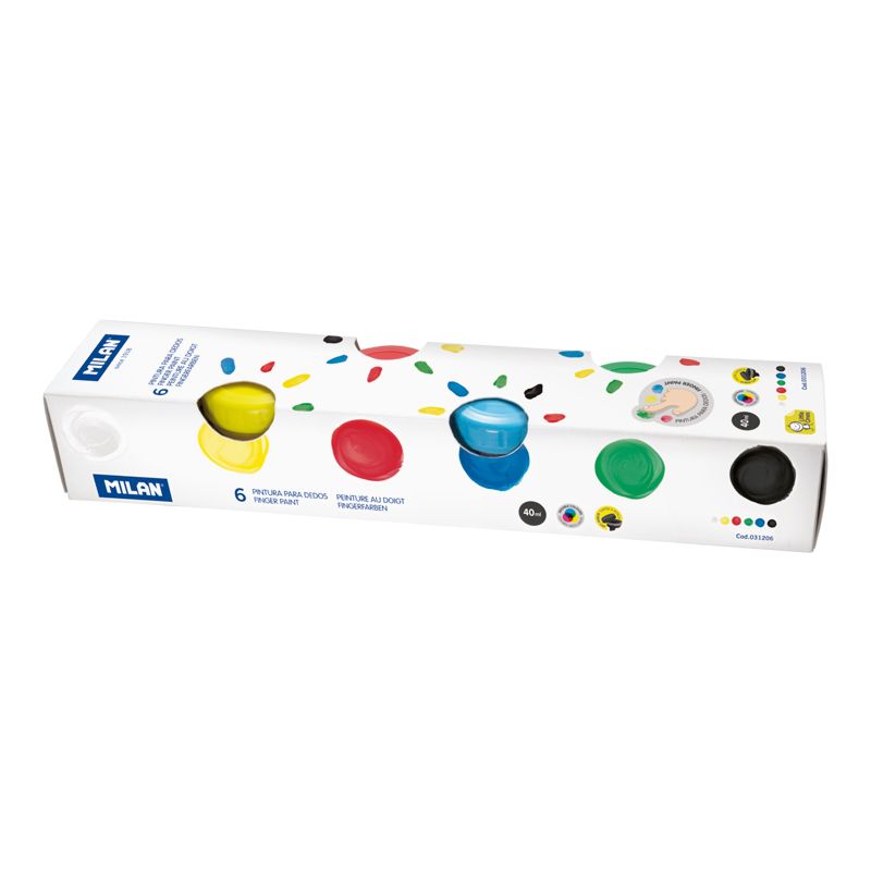 6 tarros de 40 ml. Colores: amarillo, azul, blanco, negro, rojo y verde. Pintura de dedos con una consistencia excelente para trabajar directamente con las manos, ideal para manualidades infantiles. Puede aplicarse con facilidad con los dedos, aunquetambién puede usarse con un cartoncillo, un pincel o una esponja. También sirve para crear texturas, e imprimir marcas y tampones. Los colores vivos y brillantes se pueden mezclar para crear nuevos tonos. Se lava fácilmente sobre la mayoría de tejidos. El tiempo de secado depende del grosor de pintura.