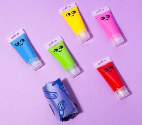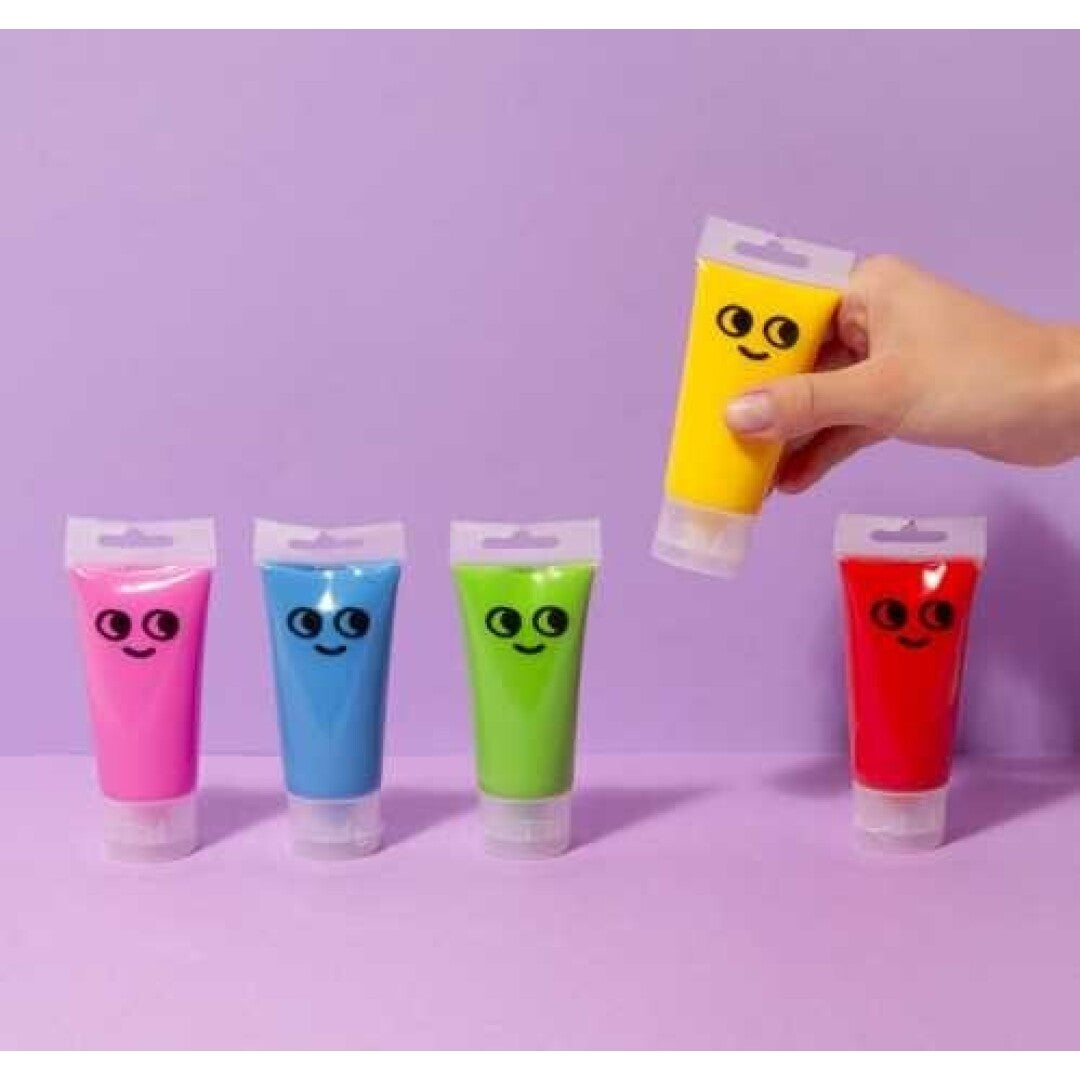 🔹 5 tubos de pintura al agua lavable (azul, verde, amarillo, rojo y rosa)