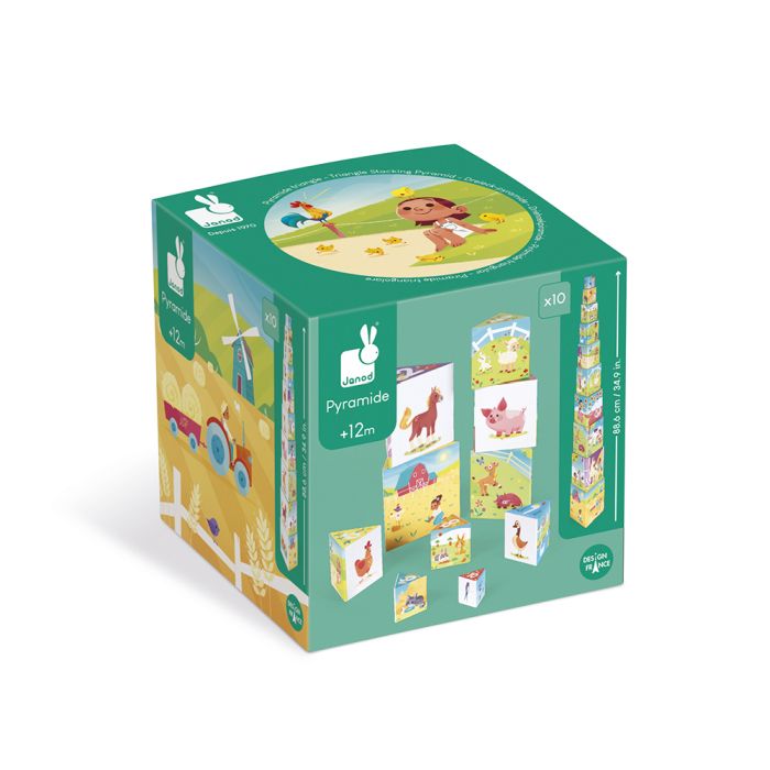 - 10 cubos triangulares de cartón ligero, perfectos para que las manitas pequeñas los apilen con facilidad.