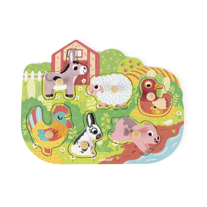 ¡Un divertido y educativo puzle de madera para los más pequeños! 🐄🐖 Con solo 6 piezas, este puzle con temática de animales de la granja es ideal para niños a partir de 18 meses. Las piezas de madera están diseñadas para adaptarse perfectamente a las manitas de los más pequeños, ayudándoles a desarrollar su motricidad fina mientras aprenden sobre los adorables animales que viven en la granja. 🐑🐓