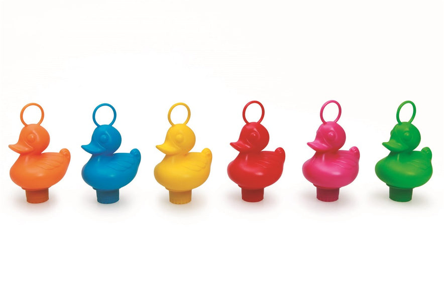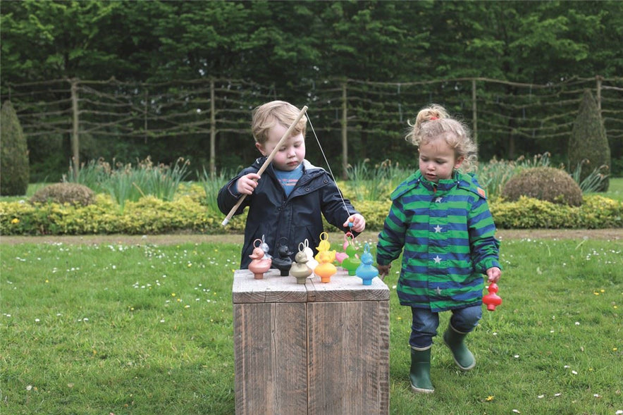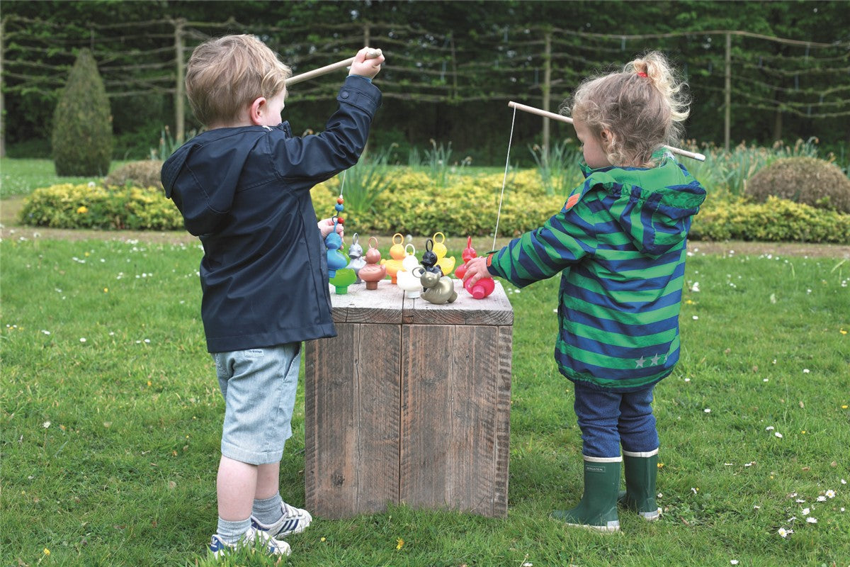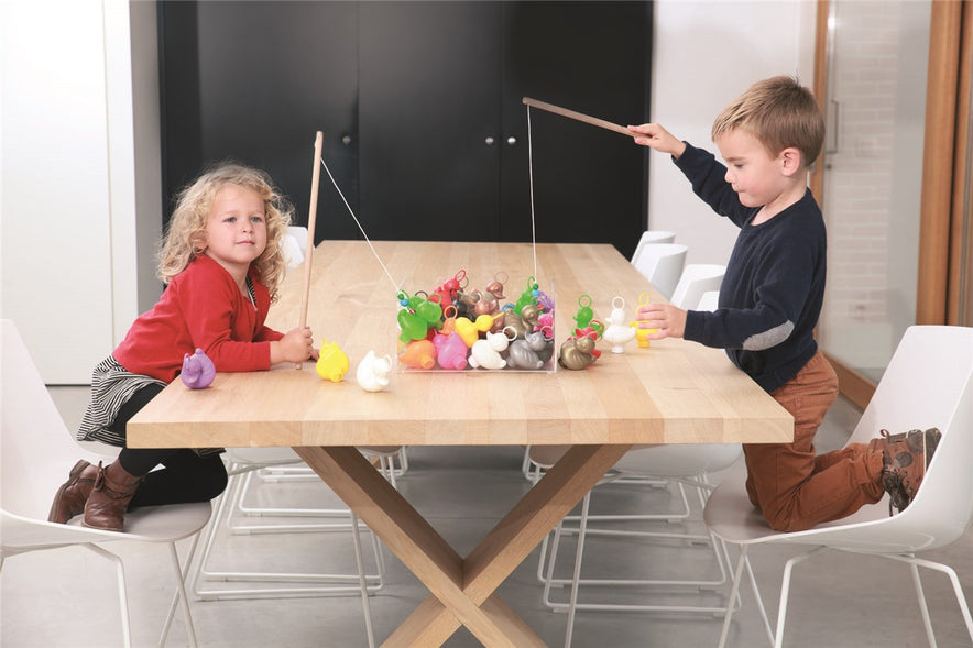 Horas de diversión pescando, dentro o fuera de casa, en la bañera o en seco. Enseña a los niños a reconocer los colores dejando que pesquen patitos de un determinado color. Para completar el juego, puedes puntear la parte inferior de los patitos con un rotulador resistente al agua. Juego de 6 patitos y 2 cañas de pescar.