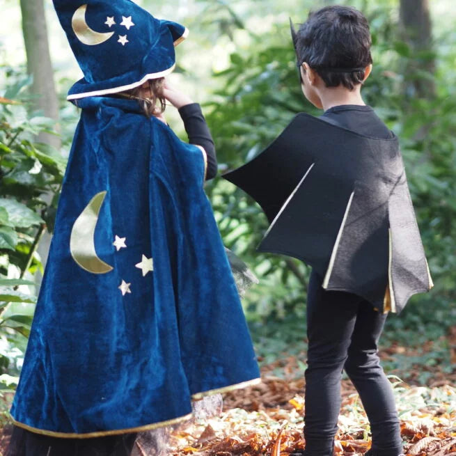 🌟 Capa mágica de terciopelo: Con forro dorado brillante y un diseño digno de los mejores magos. Se ajusta fácilmente con un cierre de velcro, ¡perfecto para tus actuaciones!