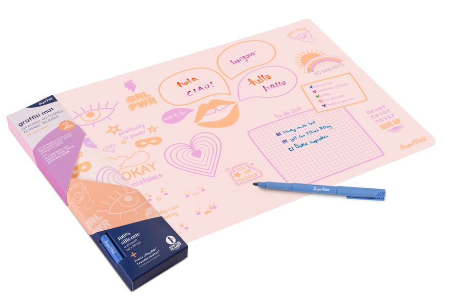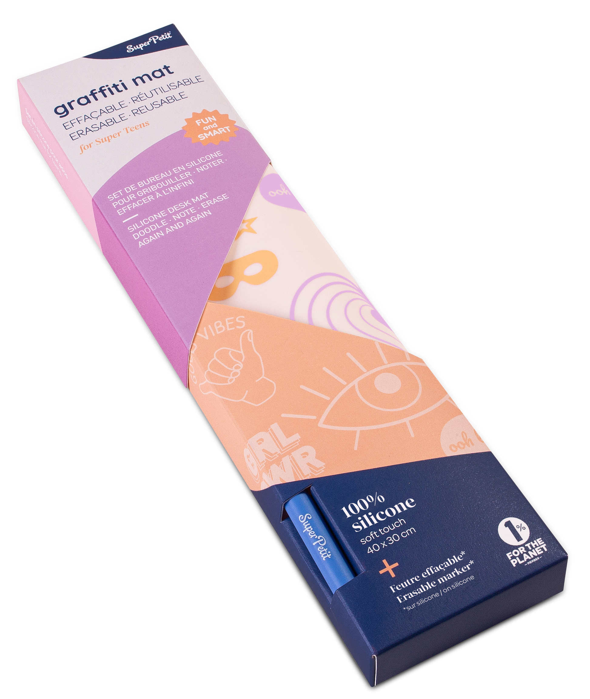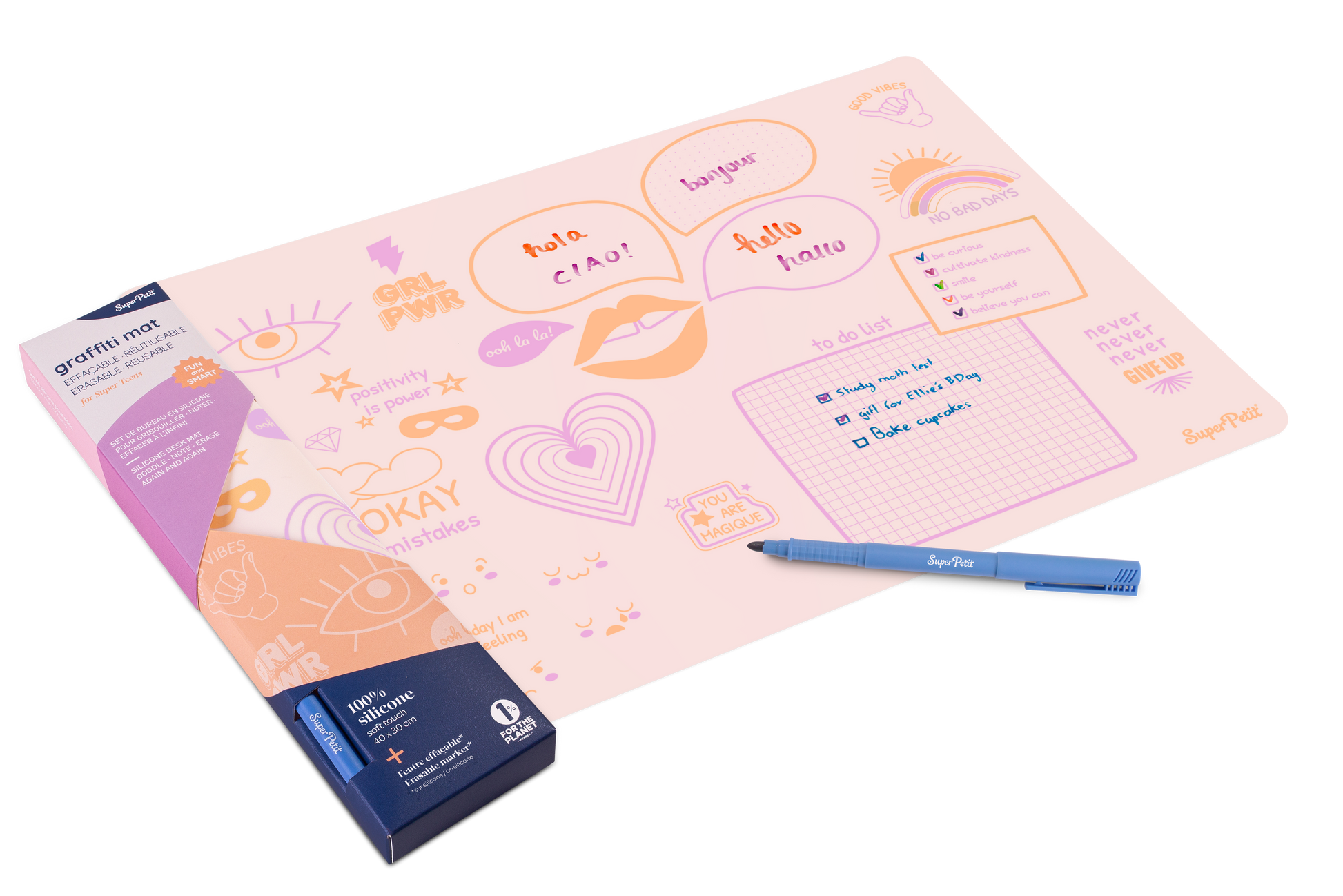 ¡El juego de escritorio «feel good» para chicas adolescentes! Práctico: un diseño divertido y estimulante para organizar tu día, desarrollar tu talento artístico, expresar tus emociones y relajarte garabateando. FÁCIL: no más cuadernos que se llenen demasiado rápido. Se puede borrar con un paño húmedo o una esponja PARTICIPATIVO: Las amigas colorean juntas el Graffiti Mat, mientras se comunican y se divierten. NOMADE: Las alfombrillas de grafiti se pueden llevar a todas partes: a la escuela, a fiestas de pijamas, en casa, al viajar, al aire libre... DISEÑO: un diseño estilizado con ojos, bocas, citas, en un estilo muy espontáneo y colores brillantes.