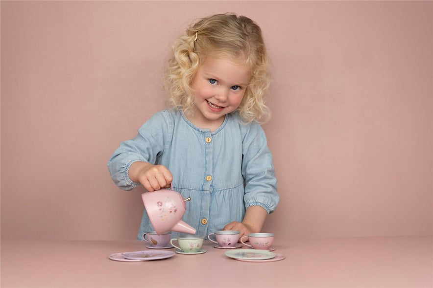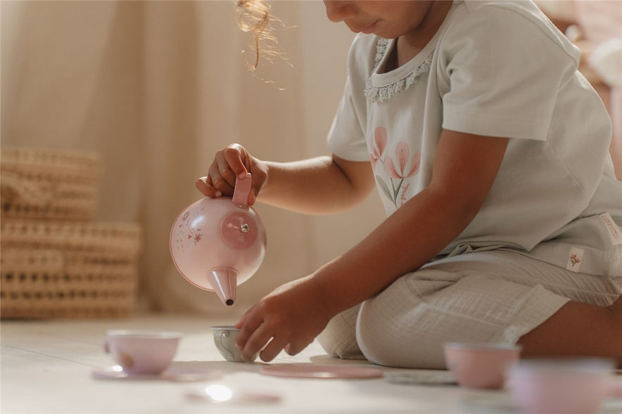 - Tetera, tazas y platillos decorados con ilustraciones de flores y hadas.