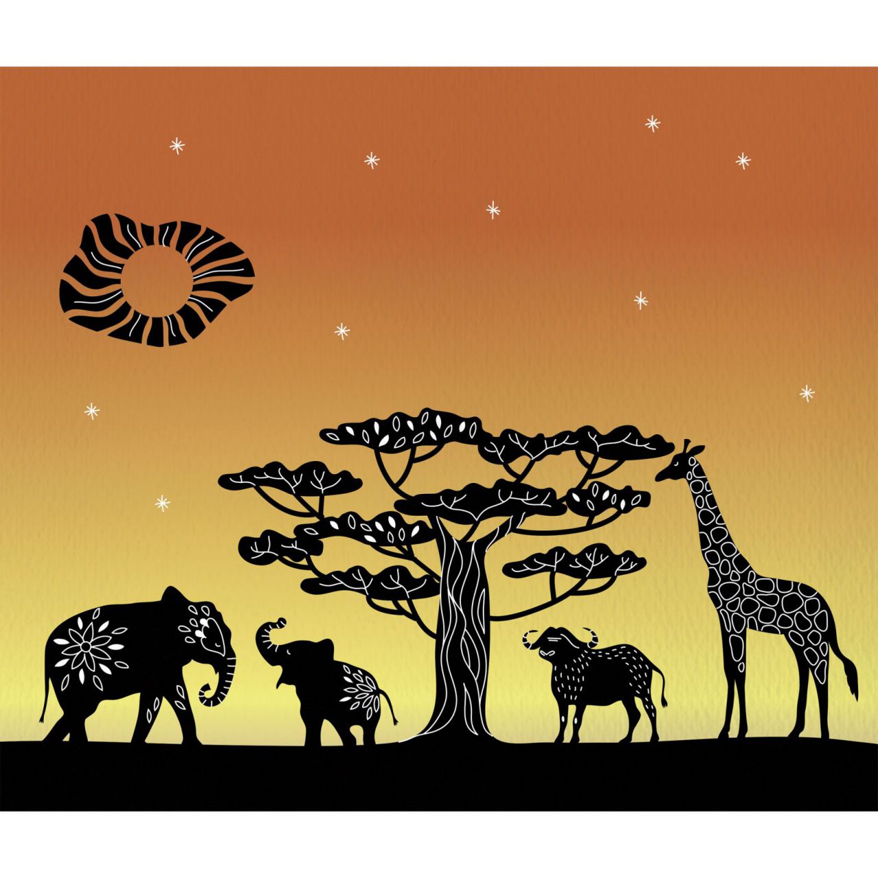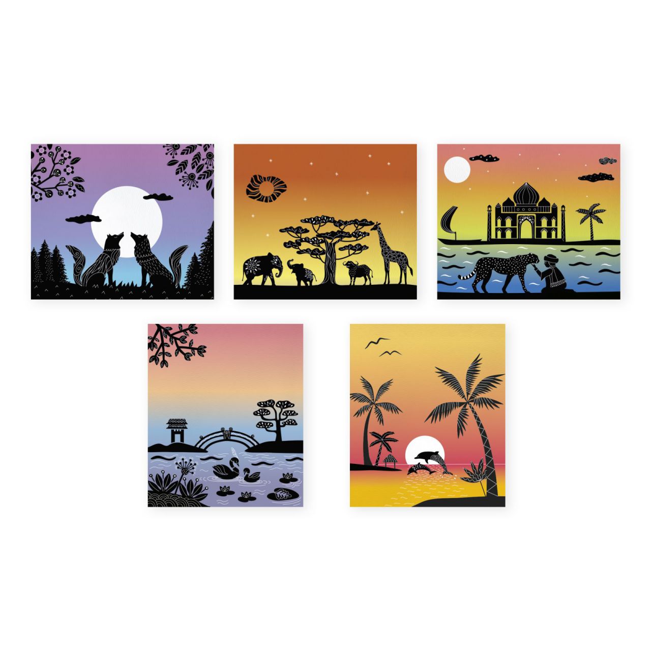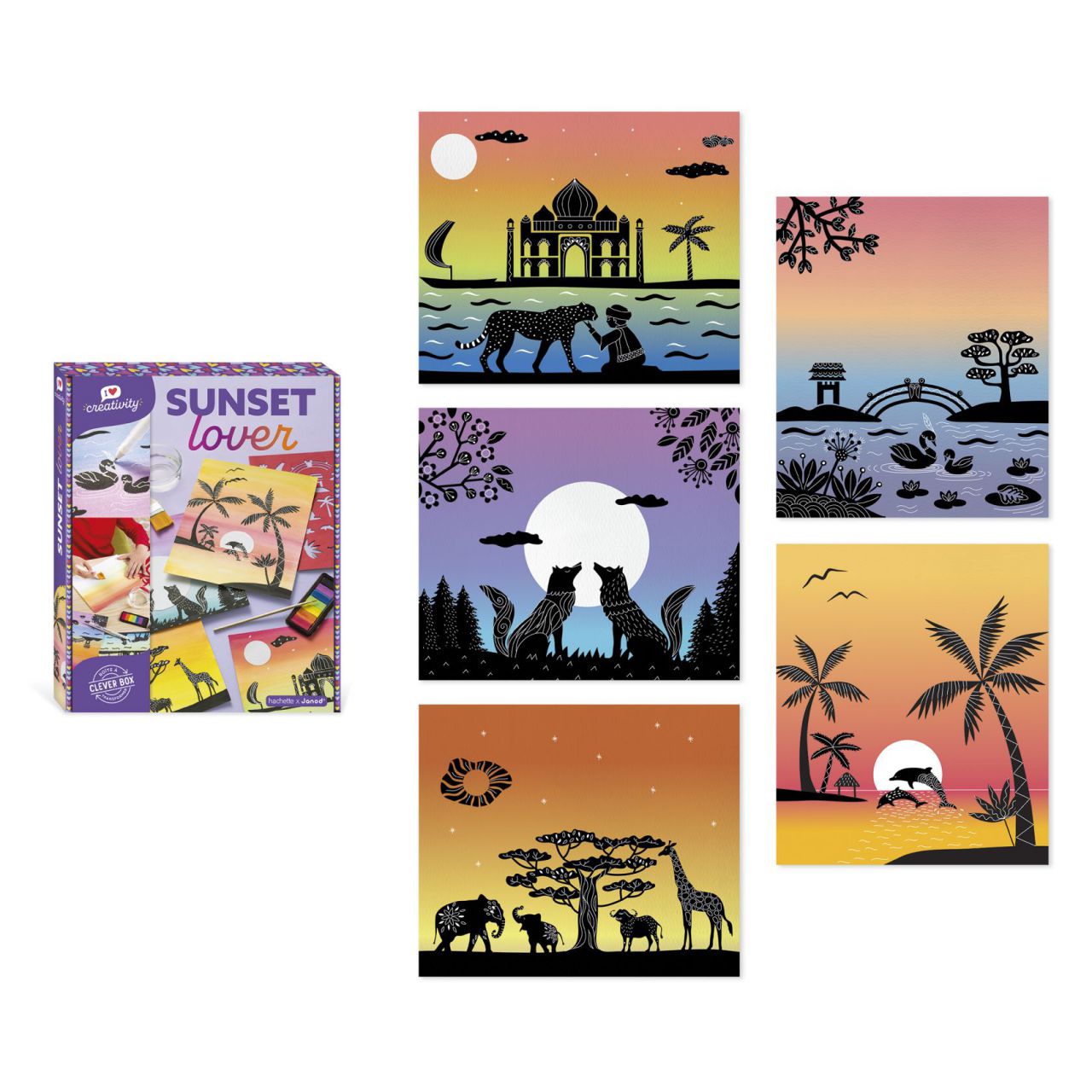 Para los pequeños creadores a partir de 8 años, este kit creativo es perfecto para diseñar 5 cuadros únicos con degradados de color que evocan mágicos atardeceres y siluetas negras en primer plano. 🖌️🌟