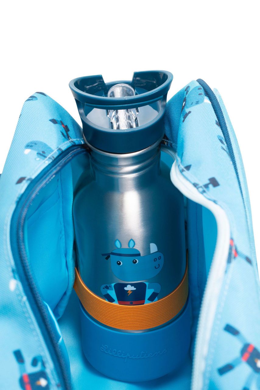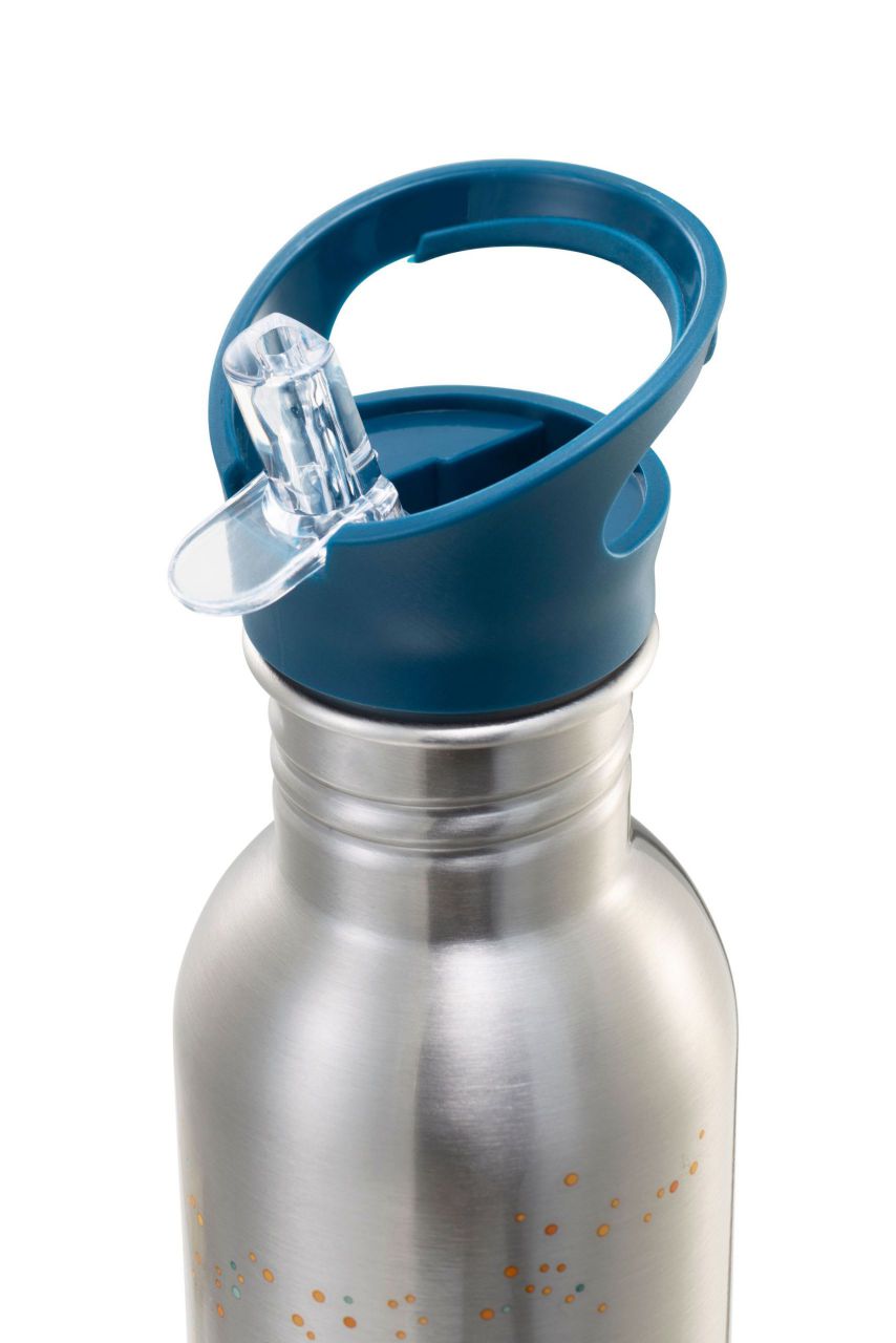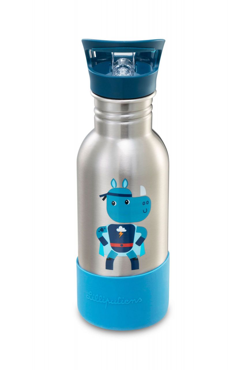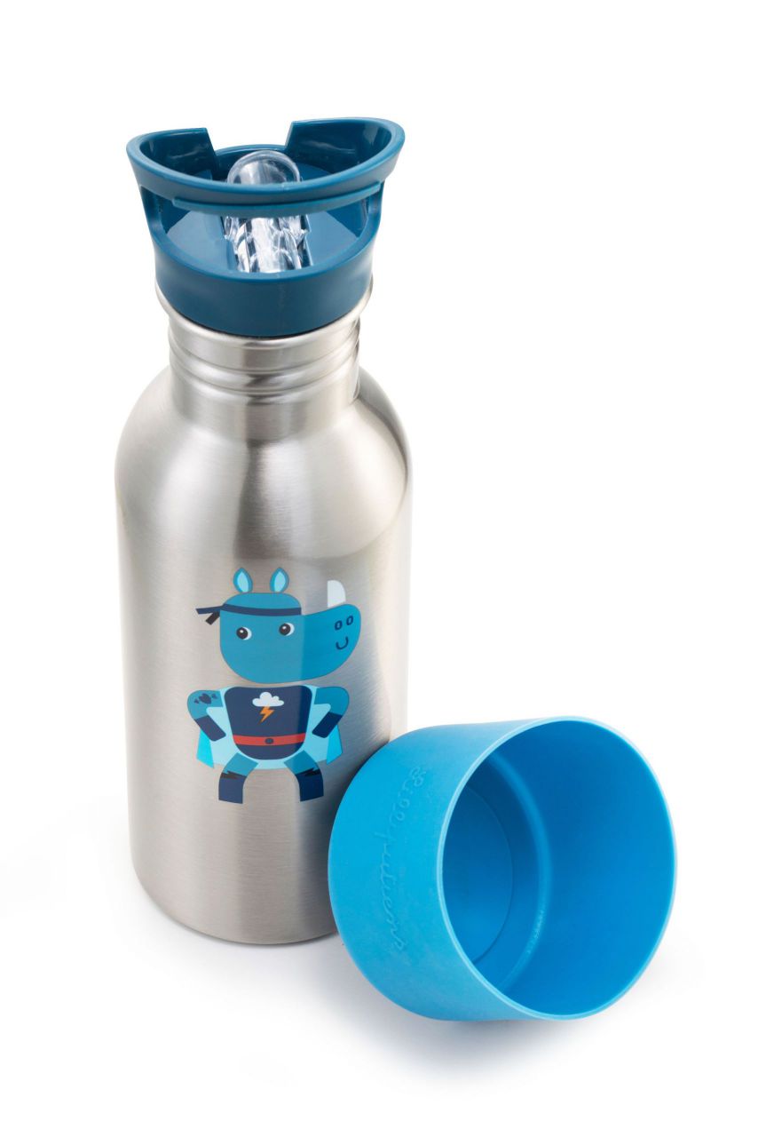 Fabricada en acero inoxidable con base de silicona antigolpes, esta cantimplora de 600 ml es ideal para el cole, excursiones o paseos.