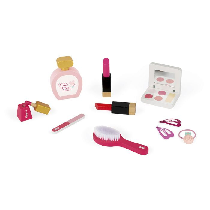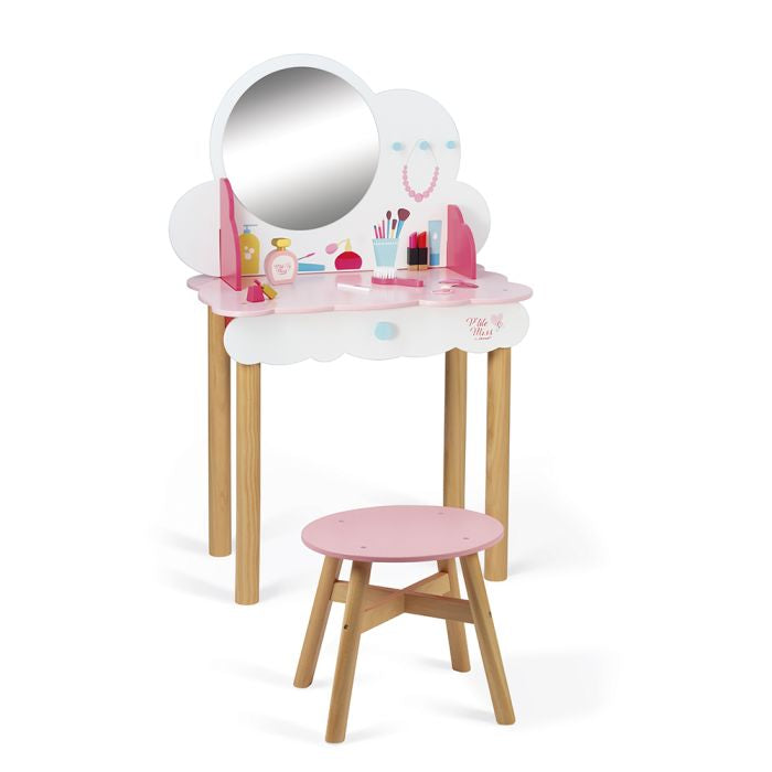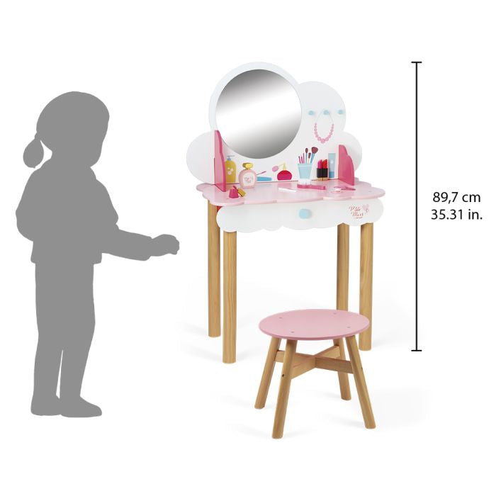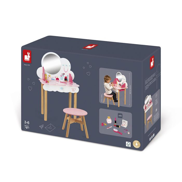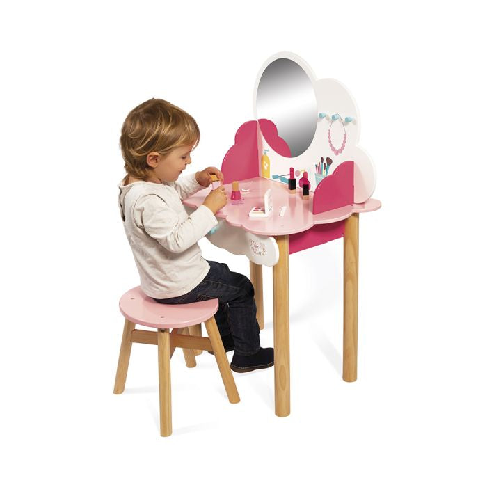 ¡Es la hora de prepararse para salir con estilo! 💄🌟 Este precioso tocador de madera permite a los niños a partir de 3 años sentarse en su taburete y sentirse como adultos mientras se preparan. Con su gran espejo para verse mejor y un cajón secreto para guardar sus cositas especiales, ¡es el lugar perfecto para guardar pequeños tesoros! ✨🔒