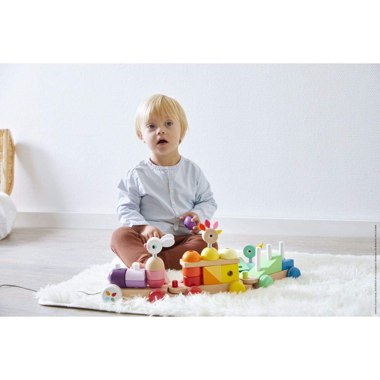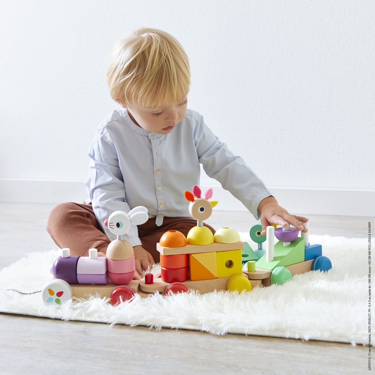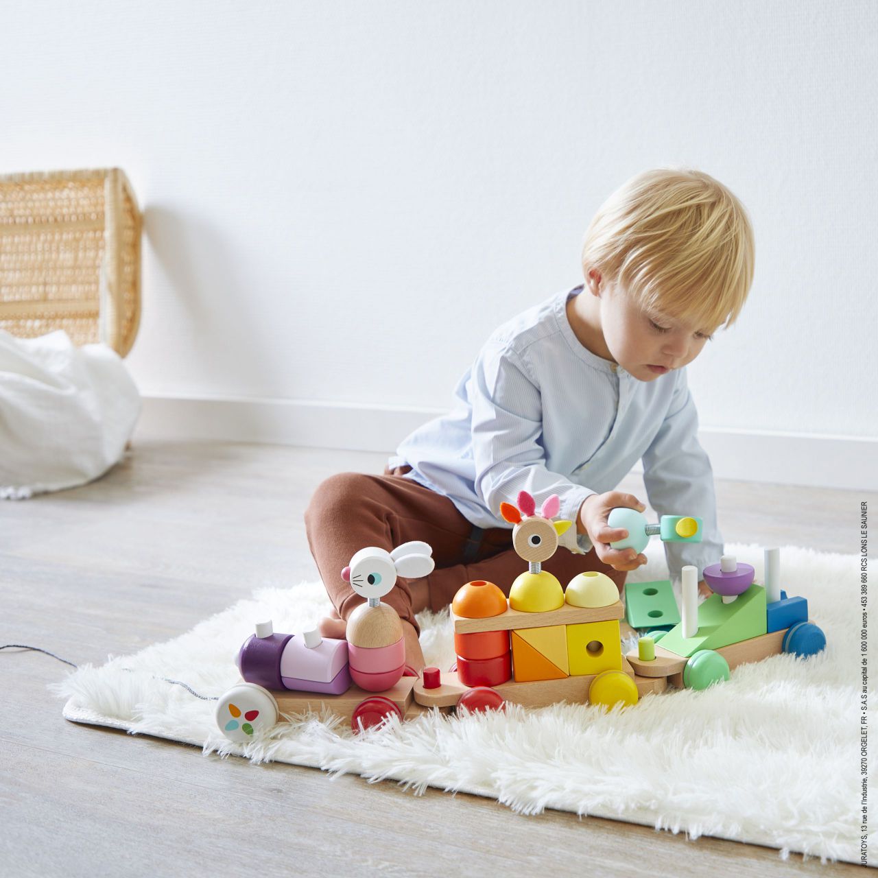 ¡El viaje está a punto de comenzar! Este juguete de arrastre de madera 2 en 1 es perfecto para bebés a partir de 1 año que quieren explorar y desarrollar su motricidad mientras se divierten. ¿Cómo? ¡Con este colorido tren de madera que también es un juego de apilar! 🎨✨