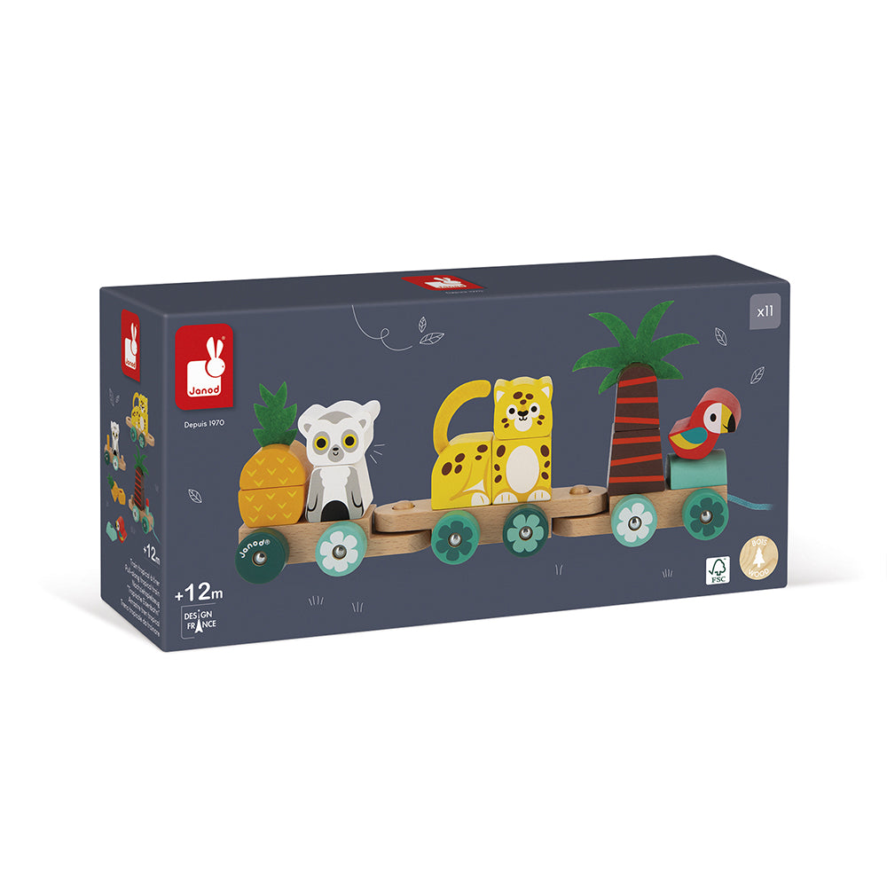 ¡Este adorable tren de madera será la nueva aventura de tu bebé! 🚂👶 Apto para niños a partir de 12 meses, ¡será el compañero perfecto para recorrer toda la casa! Además de ser un juguete de estímulo y arrastre 2 en 1, también es un juego de construcción. 🧩 Los 3 vagones extraíbles y las 11 piezas apilables permitirán crear una palmera, un lémur, un jaguar, una piña y un loro en su percha. 🦁🌴
