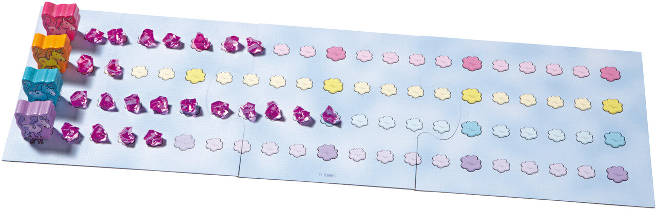 En este juego de recorrido encantador, lanzarás dados y decidirás si avanzar por el tablero o recolectar cristales. Pero ojo: ¡el primer unicornio que llegue a la meta consigue 4 cristales extra! Y al final, quien tenga más cristales gana el título de Recolector Real de Nubes 🏆