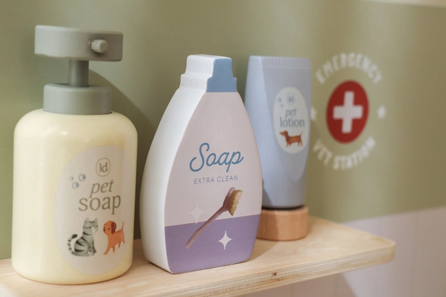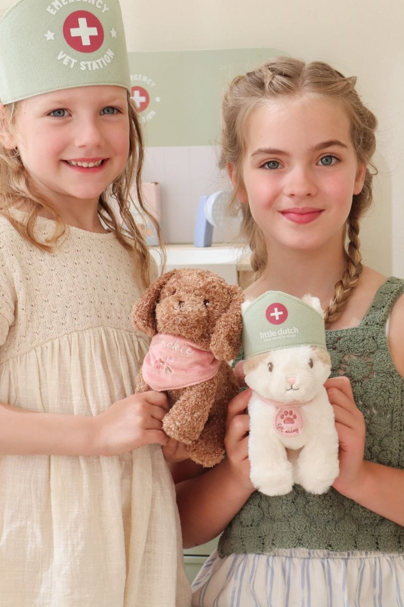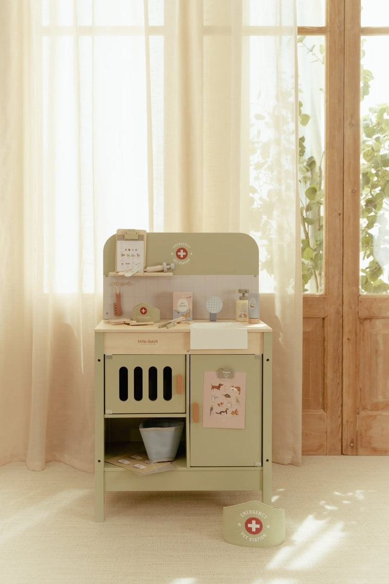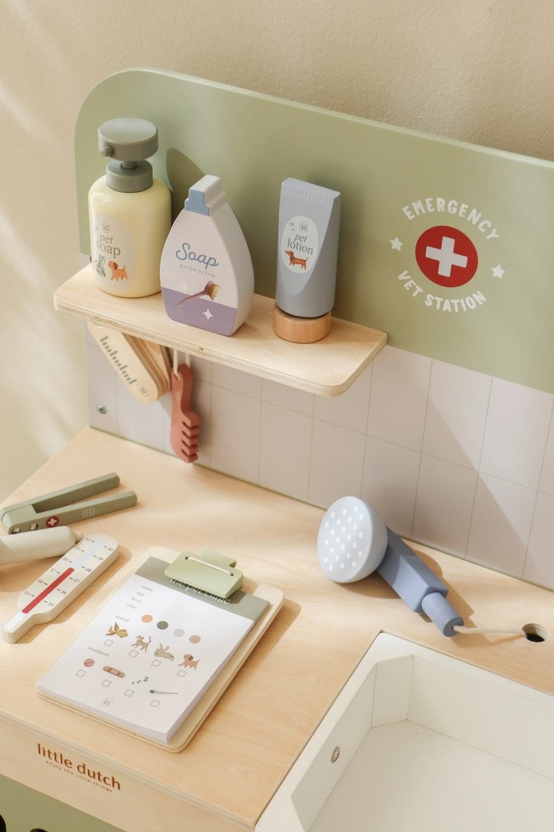 ¿Cuidas bien de peluches y mascotas de juguete enfermas? Con esta amplia clínica veterinaria de madera, tu pequeño podrá sumergirse por completo en el rol de un veterinario de verdad. El set contiene todo lo necesario para cuidar mascotas, como una ducha retráctil con lavabo, un peine, un termómetro, una jeringa y vendas. También incluye una diadema de tela y un clip especial para mostrar ilustraciones médicas y radiografías. ¡Hora del siguiente paciente!