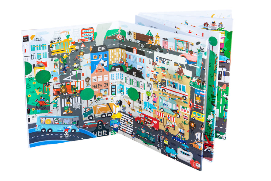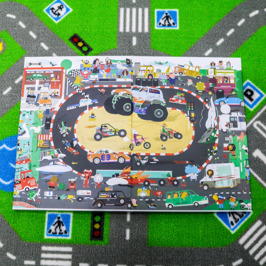 Un llibre acordió gegant sobre els vehicles que es pot desplegar fins als dos metres de llarg! En un costat hi ha les escenes i, en l’altre, un munt de curiositats increïbles i divertides per aprendre coses sobre tota mena de vehicles: des de tricicles fins a limusines, ambulàncies i camions de les escombraries, des dels més petits fins als més llargs, i fins i tot els més ràpids del món!